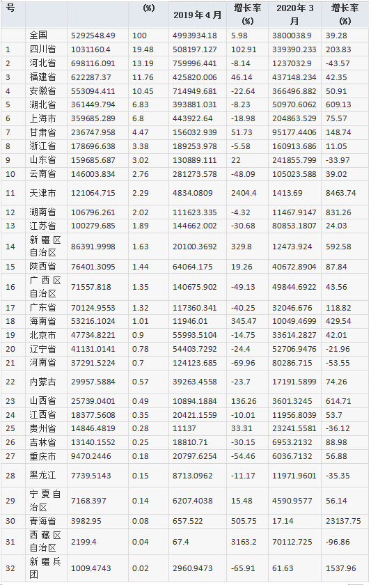 4月,全国拍卖成交额在50亿元以上的省份有4个,分别是:四川省、河北省、福建省和安徽省;